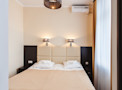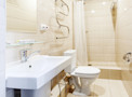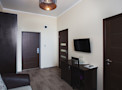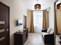 Номер «Стандарт+» – это образец интерьера, выполненного в современном европейском стиле. Просторное помещение разделено на спальню и гостиную, которые комфортно смогут разделить двое гостей. В случае необходимости есть возможность выделить еще одно дополнительное место. Спальня сохраняет принцип трех цветов: в интерьере использован нежно-бежевый, белый, коричневый цвета. Без лишних деталей, спальня выглядит уютно и имеет завершенный визуальный «образ». В гостиной сохранен такой же принцип, как и в спальне: не более трех основных цветов в декорировании помещения. Здесь размещен небольшой, но весьма удобный диван, напротив которого находится телевизор. Ванная комната – светлая, просторная, выполненная в приятной цветовой гамме, оборудована душем и необходимыми средствами личной гигиены.