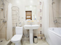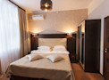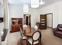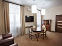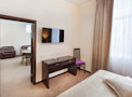 Гармоничный и эстетичный номер «Повышенной комфортности» – то, что просто необходимо для Вашего отдыха. Если Вы остановили свой выбор на этом прекрасном номере, то в Вашем распоряжении 54 кв. метра отличного сервиса, комфорта и стиля. Номер состоит из спальни и гостиной. Гостиная имеет утонченный вид: вокруг обеденного стола размещены стулья в ретро-стиле, на полках серванта расположилась посуда, кожаные кресла цвета горького шоколада дополняют уютную композицию комнаты. В спальне находится кровать, которая утопает в декоративных подушках. Вместительный шкаф и миниатюрные тумбочки не только визуально дополняют образ спальной комнаты, но и выполняют важную функцию – хранение Ваших вещей. Шикарная ванная комната оборудована душем и ванной – любители понежиться в ароматной пене после продолжительного дня оценят такую возможность.