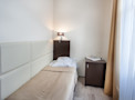 Миниатюрный номер «Стандарт+ с раздельным размещением» (малая комната) имеет небольшие габариты: всего 9 кв. метров, но даже они укомплектованы всем необходимым для хорошего отдыха. Большое окно, сквозь которое в комнату проникает достаточное количество дневного света, оформлено легкими гардинами в сочетании с плотными шторами бежевого цвета. Уютная кровать декорирована стеновой панелью, в изголовье мягко рассеивает свет настенный светильник-бра с оригинальным плафоном. В номере находится телевизор, холодильник. Не смотря на свою миниатюрность, «Стандарт+ с раздельным размещением» имеет выход на балкон, с которого Вы можете наблюдать прекрасную живописную картину.