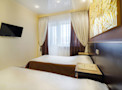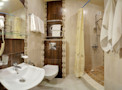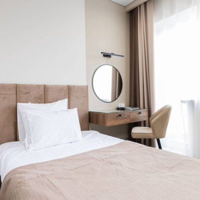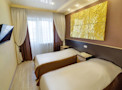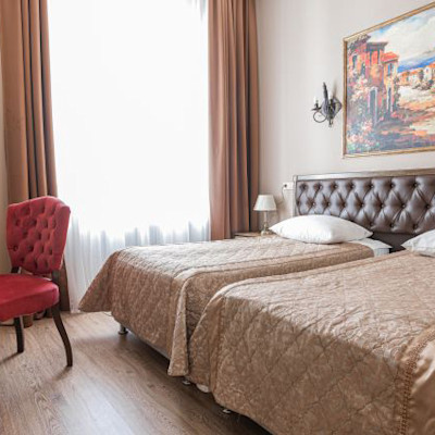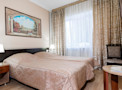 Эффектный «стандарт» оформлен по всем канонам классического стиля. Молочно- шоколадная цветовая гамма задает атмосферу уюта и способствует гармоничному безмятежному отдыху. В роли яркой «изюминки» декора выступает необычное золотистое панно, расположенное у изголовья кровати. Благодаря наличию большого зеркала номер кажется просторнее.