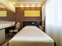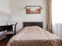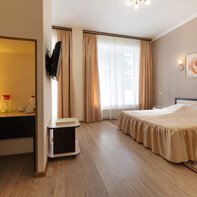Элегантный интерьер «стандарта» придется по душе даже самым взыскательным гостям. В оформлении доминируют черты классического стиля, необычная настенная композиция над кроватью отсылает к стилистике модерна. В качестве базовых оттенков дизайнеры выбрали шоколадный, молочный и цвет капучино, благодаря чему пространство утопает в атмосфере уюта. Большое зеркало отлично вписывается в общую концепцию интерьера и визуально делает комнату просторнее.