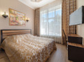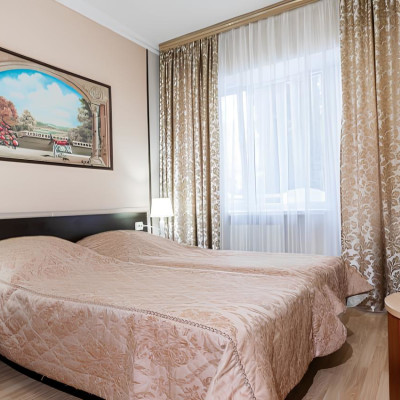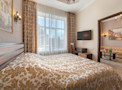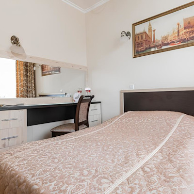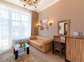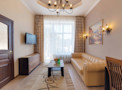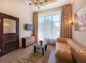 Роскошный «люкс» покоряет атмосферой изысканности и респектабельности. В основе оформления классический стиль, при этом изящные кованые люстры напоминают королевские интерьеры, а эффектный кожаный диван отсылает к стилистике русского ампира. Благодаря доминированию бежевых оттенков номер полон уюта и домашнего тепла. Ярким акцентом становятся картины с городскими пейзажами.
