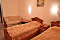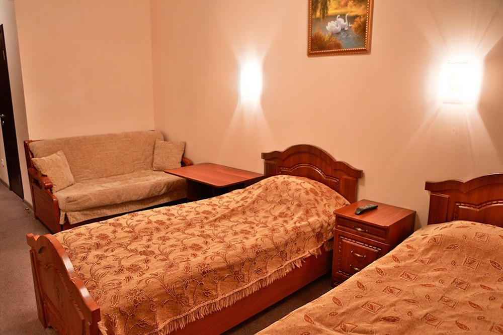 Гости могут расположиться на односпальных кроватях, или по желанию на мягком диване, расположенном также в номере. Прикроватные тумбы, вместительный шкаф, большое настенное зеркало, тумба под ТВ, журнальный столик и тумбочка для хранения посуды – всё необходимое в номере.