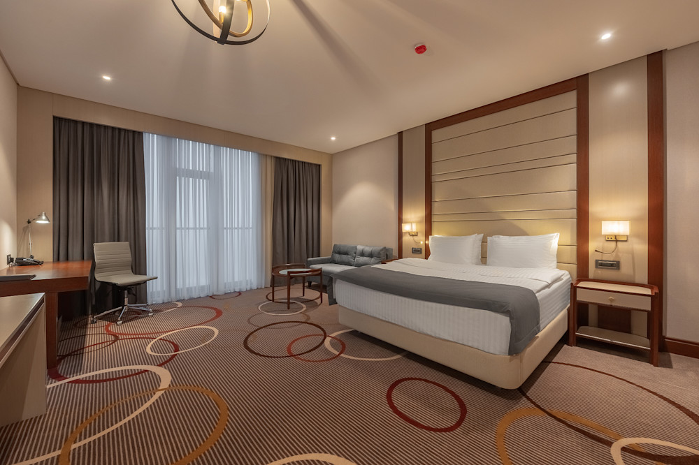 Номер окутан уютной атмосферой, которая погружает в приятное умиротворение. Интерьер выполнен в нейтральных оттенках, большое количество источников света дополняет общую визуальную концепцию номера. Помещение разделено на две комнаты: в одной расположена большая кровать, мягкий диван с обивкой стильного серого цвета, рабочая зона со столом и удобным стулом. В маленькой спальне размещена односпальная кровать с ортопедическим матрасом. Из номера есть выход на миниатюрный балкон.