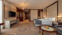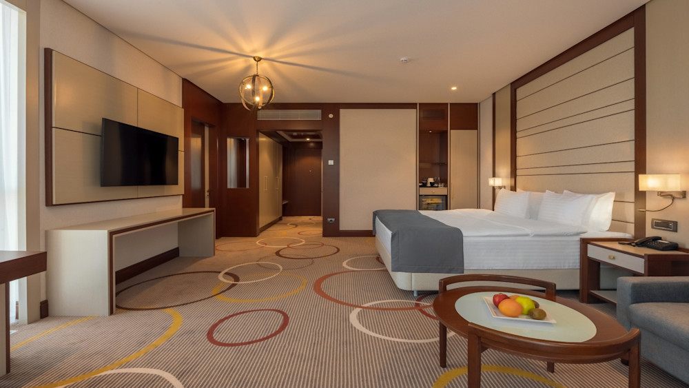 Пространство зонировано на гостиную и спальню: в каждой из комнат чувствуется индивидуальность, которая не противоречит общей концепции номера. Благодаря тому, что в гостиной есть дополнительное спальное место, в номере могут поселиться до 6 человек. Спальная комната обустроена двуспальной кроватью, небольшим диваном, туалетным столиком. В гостиной установлен вместительный диван, на котором будет прекрасно провести вечерний досуг. Ванная комната поразит своими масштабами: выполненная в молочной цветовой гамме, оборудована душевой кабиной и стильной раковиной, встроенной в консоль. Огромное зеркало имеет яркую подсветку, на полках ванной комнаты размещены полотенца и туалетные принадлежности.