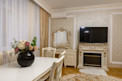 Интерьер данного номера выполнен в светло-бежевых тонах, что располагает к прекрасному отдыху. И без того, красивые комнаты украшены декоративной лепниной.
