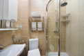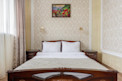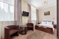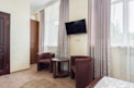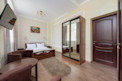 Двухместный номер «Джуниор» имеет интерьер в классическом стиле: обои декорированы вставками в виде узоров – яркого стилистического элемента классического дизайна . Здесь использована пастельная цветовая гамма, на фоне которой контрастно выглядит мебель, выполненная из дерева. Шикарная кровать занимает центр комнаты, ее украшает резное изголовье и настенные светильники. К кровати примыкают миниатюрные светильники, которые составляют единую визуальную композицию спального места. Зона досуга состоит из тандема кресла интересной формы и журнального столика. В комнате размещен ковер с длинным ворсом – приятное дополнение интерьера. Ванная комната – небольших размеров и очень уютная, укомплектована принадлежностями для личной гигиены, набором полотенец и халатами.