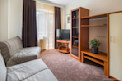 Ванная комната с ванной дополнена набором туалетных средств, халатами и тапочками. Практичная мебель, включая удобный шкаф для одежды и кресло, а также ежедневная подача питьевой воды и ковровое покрытие делают ваш семейный отдых по-настоящему заботливым и беззаботным.