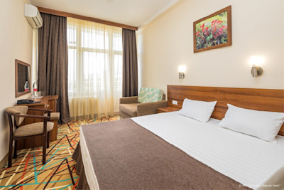 Уютный и функциональный номер категории «Стандарт» на второй линии предлагает комфортное размещение для двух гостей. Вы можете выбрать конфигурацию с большой двуспальной кроватью или двумя раздельными кроватями. Для дополнительного гостя предусмотрено раскладное кресло или еврораскладушка, что делает номер отличным выбором для небольшой семьи или компании друзей. Собственный балкон добавит отдыху приятных моментов.