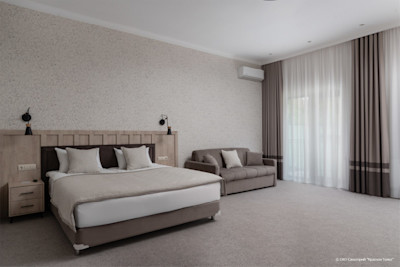 Стандарт Улучшенный «Ривьера» — это номер высшей категории, созданный для максимального комфорта. Просторное размещение с кроватью «King-size», современная мебель и функциональная зона с рабочим столом создают атмосферу уюта. Высокоскоростной Wi-Fi, видеотелевизор с плоским экраном и сплит-система гарантируют приятный и технологичный отдых.