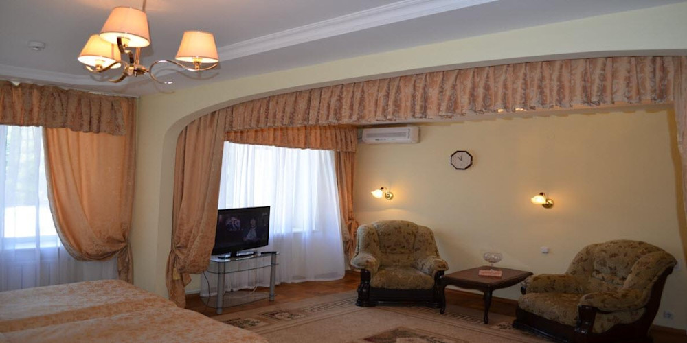 В гостиной большой диван и два кресла, плоский телевизор с кабельными каналами, холодильник с чайником и чайным набором, комод под личные вещи, сейф для сохранности ценностей и WI-FI в номере. В гостиной допускается дополнительное размещение гостей, площадь номера позволяет разместить всех гостей в комфортных условиях.