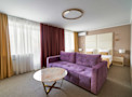 Визуально номер зонирован на спальню и гостиную. В зоне отдыха размещена большая кровать (или две кровати поменьше – зависит от количества гостей), по обе стороны установлены тумбочки с настольными светильниками. В изголовье кровати закреплены настенные бра как ещё один дополнительный источник освещения. Шикарная люстра над мягким диваном привлекает своим эффектным внешним видом. Зона гостиной оборудована телевизором с плоским экраном, консолью благородного светло-бежевого оттенка. На полу в номере постелено ковровое покрытие.