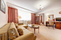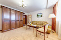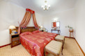Роскошный «люкс» оформлен в классическом стиле с эффектными восточными мотивами. Балдахин из золотисто-красной парчи и пуфы на изящных ножках привносят в интерьер атмосферу сказки. В роли яркого акцента выступает эффектный туалетный столик с большим зеркалом. Элегантный буфет с хрустальной и фарфоровой посудой играет не только функциональную, но и эстетическую роль.