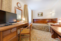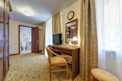 Номер оформлен в элегантном классическом стиле, дизайнеры учли каждую мелочь. Узор на шторах и покрывалах отлично сочетается с цветовой гаммой ковров, а эффектные светильники прекрасно гармонируют с миниатюрными цветочными вазами. Добротная деревянная мебель несет не только функциональную, но и эстетическую роль.