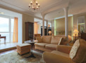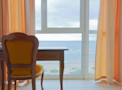 Отдельного упоминания заслуживают огромные панорамные окна, из которых открываются роскошные виды на бескрайнюю гладь моря и ухоженную территорию здравницы. Здесь же организована и небольшая рабочая зона, которая непременно придется по вкусу тем, кто привык даже на отдыхе оставаться в тонусе и не забывать о деловых вопросах.