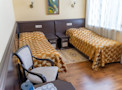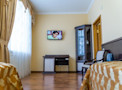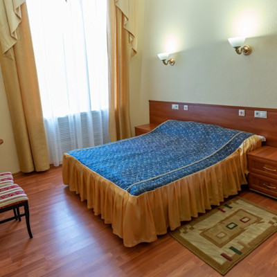 В помещении предусмотрено все необходимое, чтобы обеспечить отдыхающим комфортный отдых. В комнате установлены две односпальные кровати и две тумбочки. Также имеются шкаф, предназначенный для хранения вещей, письменный стол, два стула, большое зеркало и настенные светильники. Интерьер номера выполнен в приятной постельной гамме. Данный номер можно рекомендовать двум компаньонам, а также человеку, который отдыхает вместе со своим ребенком.