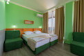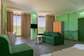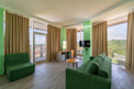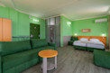 Роскошный номер студийного типа, предназначенный для размещения 2 человек, обеспечивает невероятно комфортный отдых. Гостям пансионата непременно придется по вкусу стильный интерьер помещения – нежно-бежевые стены удачно оттеняет контрастная мебель, выполненная в серых тонах. Ковровое покрытие фисташкового цвета становится ярким акцентом и привносит в декор нотки респектабельности и шика.