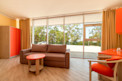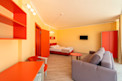 Стандарт без балкона в санатории «Шексна» — это просторный двухкомнатный номер, рассчитанный на комфортное размещение до четырёх гостей. Интерьер выполнен в светлых тонах с яркими акцентами, создающими уютную и жизнерадостную атмосферу.